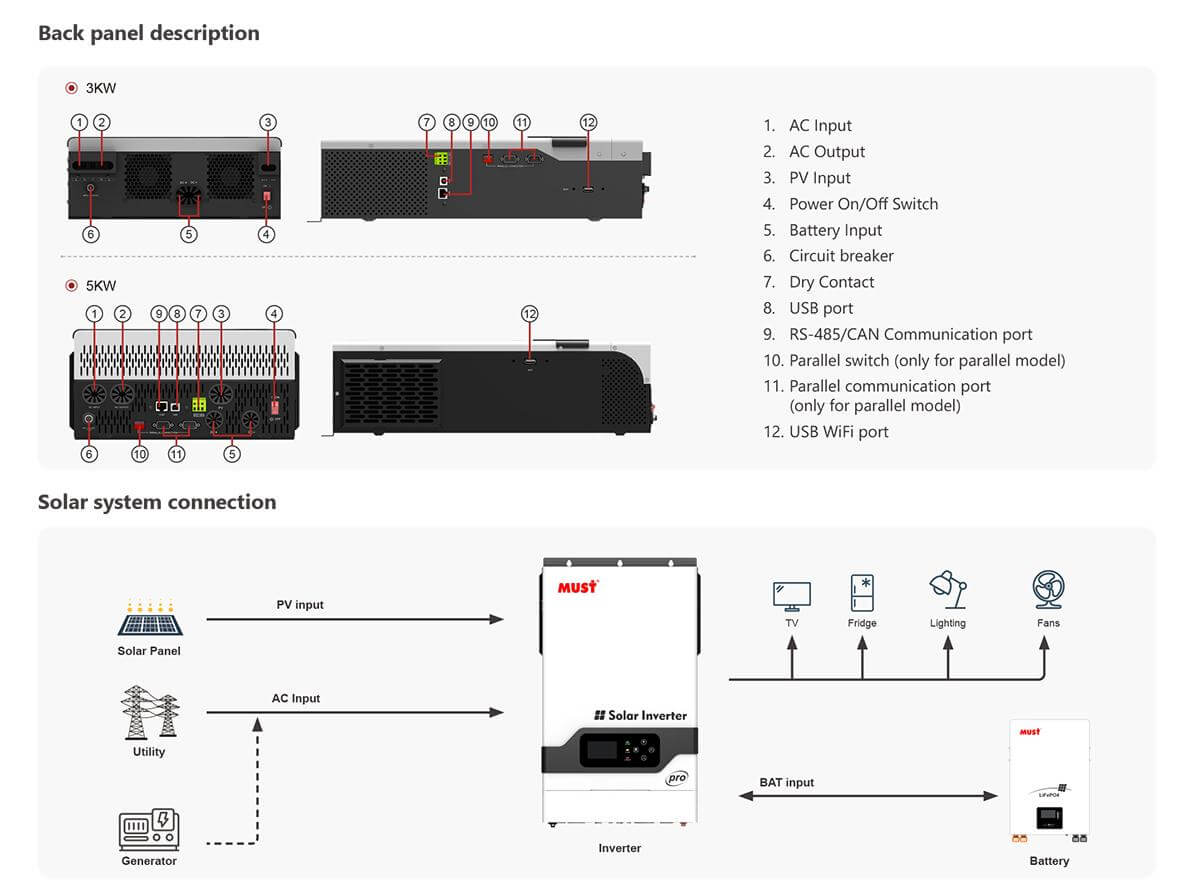 The MUST Off-Grid Solar Inverter is a robust and reliable power solution for your off-grid needs. Whether you’re looking to power lights, fans, TVs, fridges, or even small appliances in your home or business, this 5.2KVA inverter with a 48V system can handle it all. With its pure sine wave technology, the inverter ensures smooth and efficient energy conversion for sensitive electronic equipment, helping you save on electricity bills and become more sustainable.
